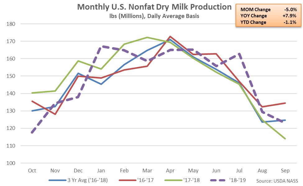 • Sep ’19 combined production of U.S. nonfat dry milk and skim milk powder increased 6.9% on a YOY basis, finishing higher for the third consecutive month. Nonfat dry milk production increased 7.9% YOY throughout the month while skim milk powder production increased 4.6% YOY.