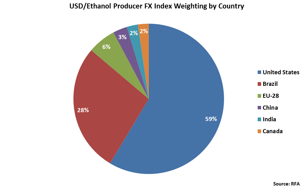 The U.S. accounts for half of the USD/Ethanol Producer FX Index while Brazil accounts for over a quarter of the index.