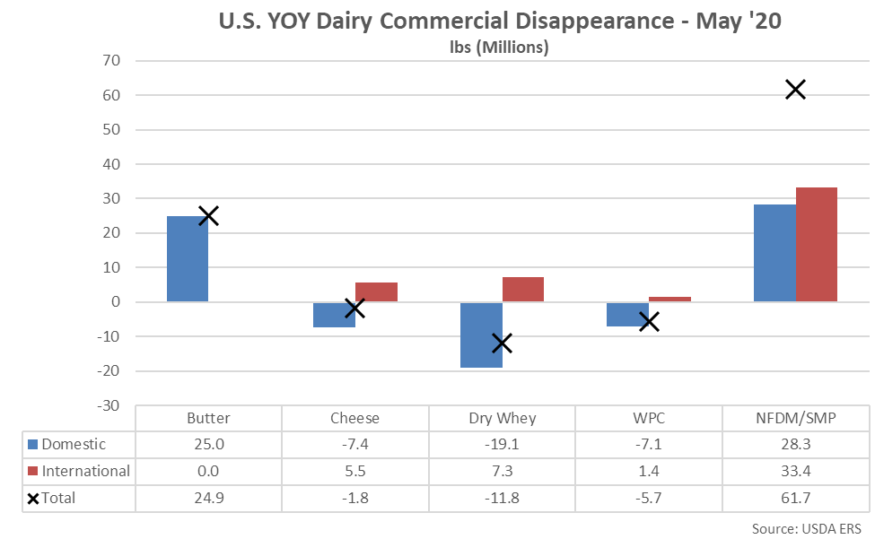 U.S. dairy commercial disappearance figures provided by the USDA were recently updated with values spanning through May ’20. Highlights from the updated report include: