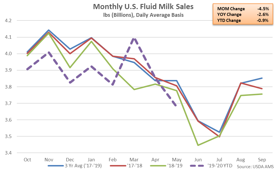 - U.S. fluid milk sales declined on a YOY basis for the first time in the past three months during May ’20, finishing down 2.6% and reaching a record low seasonal level. Sales of fat-free milk declined to the lowest monthly level on record.
