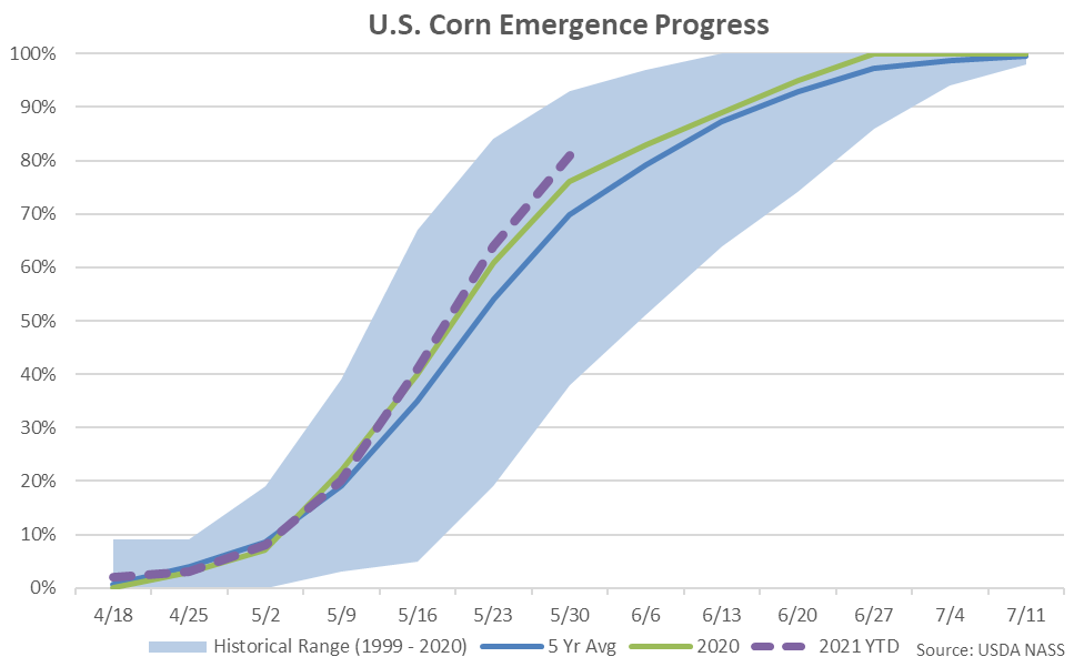 Corn emergence as of the week ending May 30th was 81% complete, finishing ahead of last year’s pace of 76% completed and the five year average pace of 70% completed.