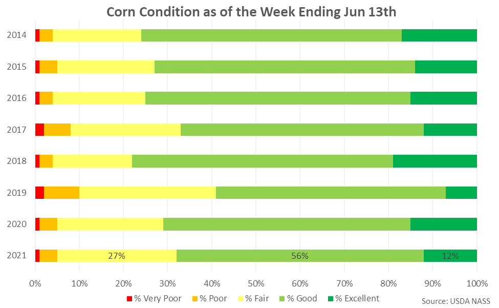 68% of the current corn crop was identified to be in good or excellent condition as of the week ending Jun 13th, down four percent from the previous week. The current corn crop identified to be in good or excellent condition finished slightly below analyst expectations of 69%. Five percent of the current corn crop was identified to be in very poor or poor condition, unchanged from the previous week.