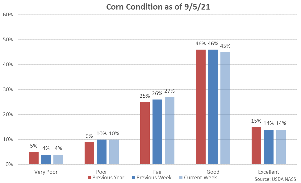 59% of the current corn crop was identified to be in good or excellent condition as of the week ending Sep 5th, down one percent from the previous week. The current corn crop identified to be in good or excellent condition finished slightly below analyst expectations of 60%. 14% of the current corn crop was identified to be in very poor or poor condition, unchanged from the previous week.