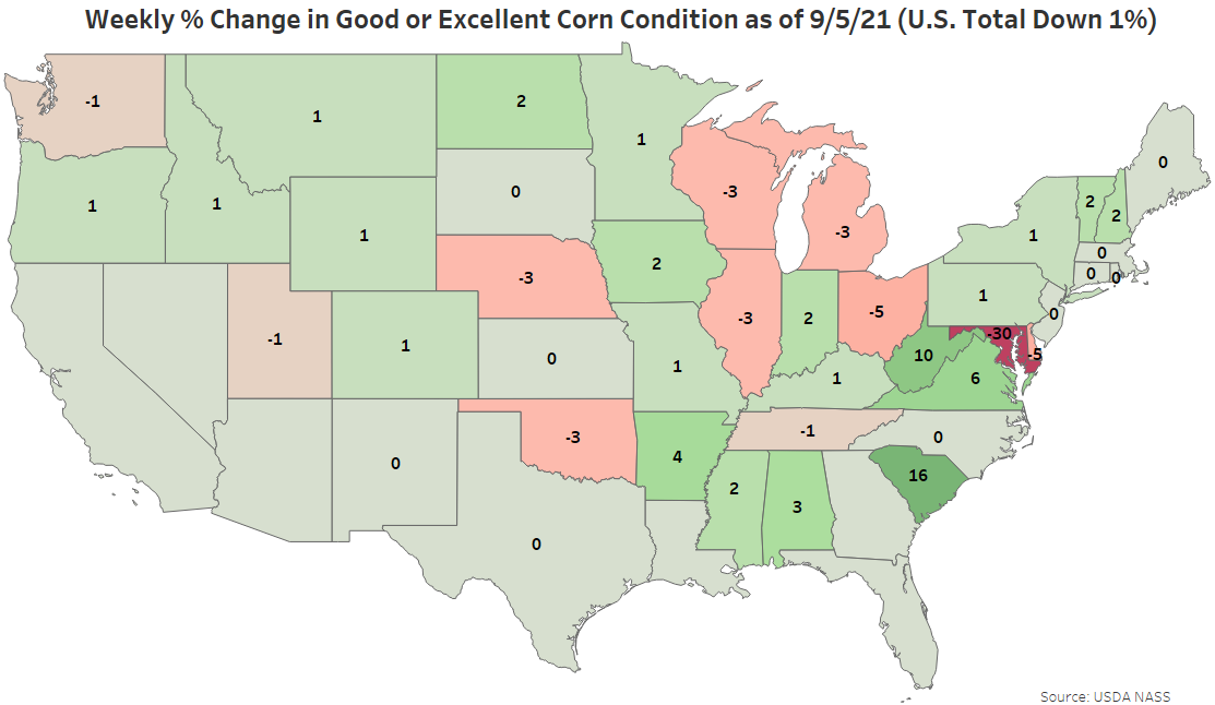 According to the USDA, the percentage of corn identified to be in good or excellent condition as of Sep 5th declined slightly from the previous week, finishing slightly below analyst expectations. The percentage of soybeans identified to be in good or excellent condition as of Sep 5th increased slightly from the previous week, finishing equal to analyst expectations.