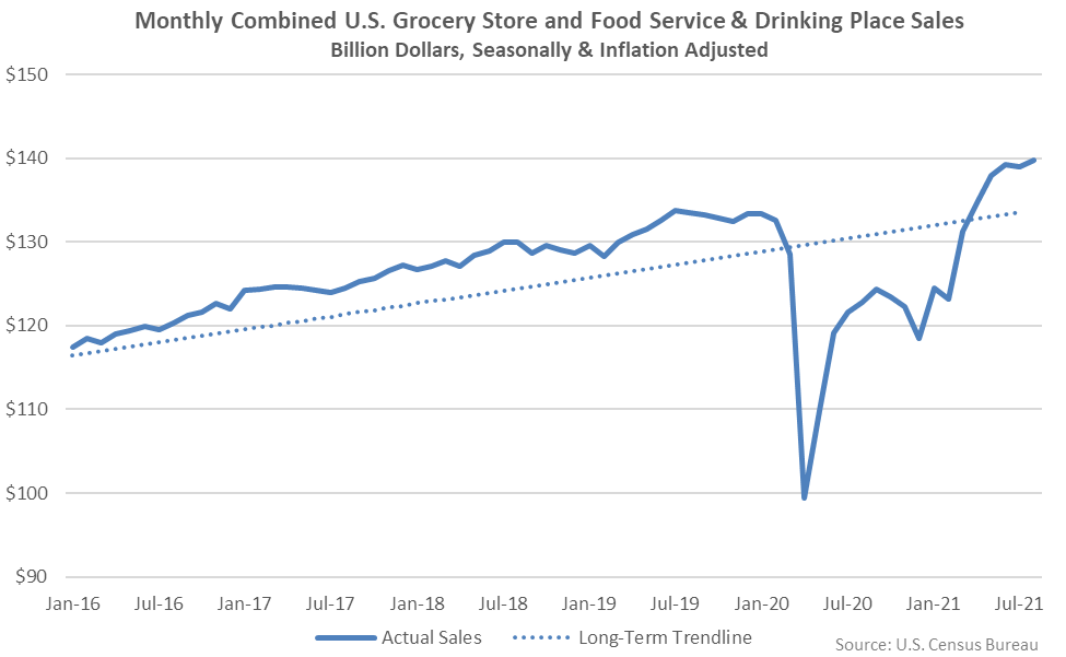 Combined grocery store and food service & drinking place sales remained at a record high monthly level throughout Aug ’21, up 0.6% from the previous month and finishing 4.4% above pre-pandemic trendline figures when adjusted for inflation.