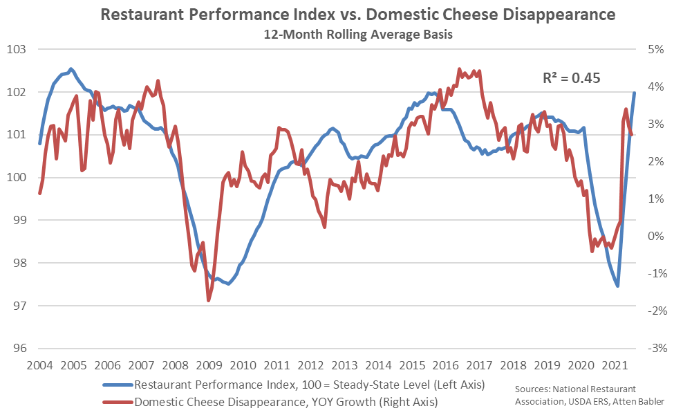 The RPI has exhibited a moderate correlation with domestic cheese demand, historically, as the restaurant industry has been a main source of consumption growth. The correlation in the RPI and YOY growth in domestic cheese demand was most pronounced following the financial crisis of 2008, when both declined significantly, each reaching record low levels on a 12-month rolling average basis. Similar declines have been exhibited through the COVID-19 pandemic, with each metric rebounding since.