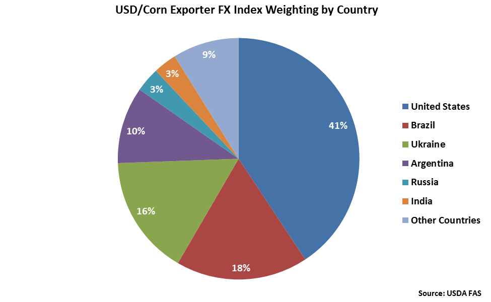 The United States accounts for over two fifths of the USD/Corn Exporter FX Index, followed by Brazil at 18%, Ukraine at 16% and Argentina at 10%.