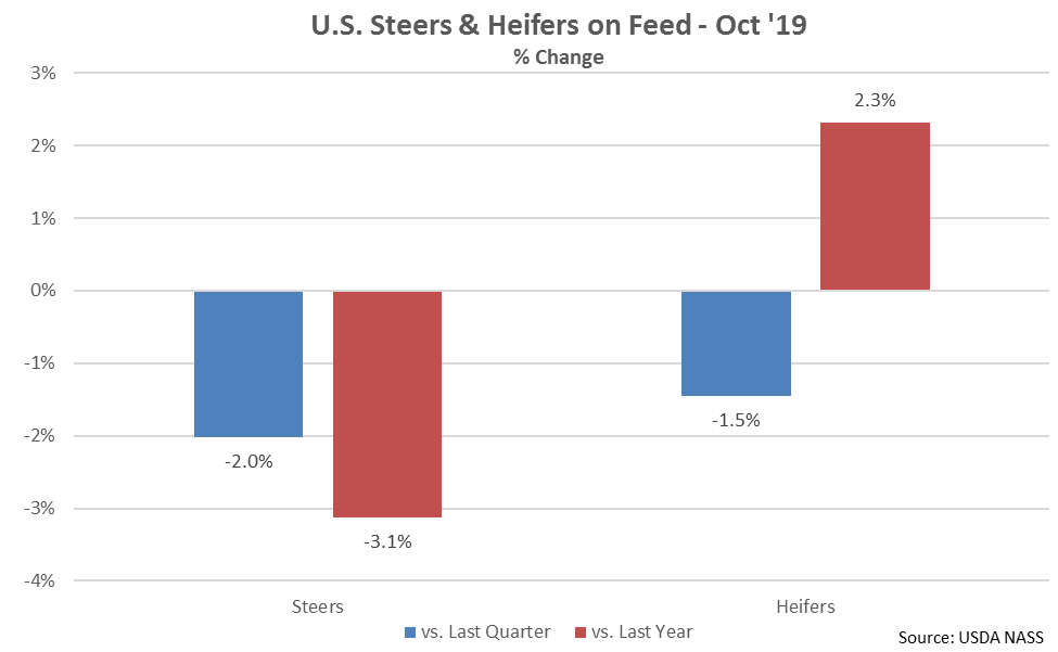 U.S. cattle on feed figures provided by USDA were recently updated with values spanning through the end of Sep ’19. Highlights from the updated report include: