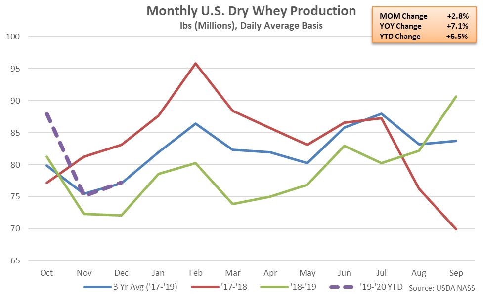 Dec ’19 U.S. dry whey production increased 7.1% YOY, finishing higher on a YOY basis for the fifth consecutive month. A 21.0% YOY increase in Central U.S. dry whey production more than offset lower Atlantic U.S. (-0.7%) and Western U.S. (-7.2%) production experienced throughout the month. Combined whey protein concentrate (WPC) and whey protein isolate (WPI) production remained lower on a YOY basis for the 11th consecutive month during Dec ’19, however, finishing down 5.3%. The YOY increase in dry whey production more than offset the YOY declines in WPC and WPI production experienced throughout Dec ’19, resulting in combined production increasing by 1.9%.