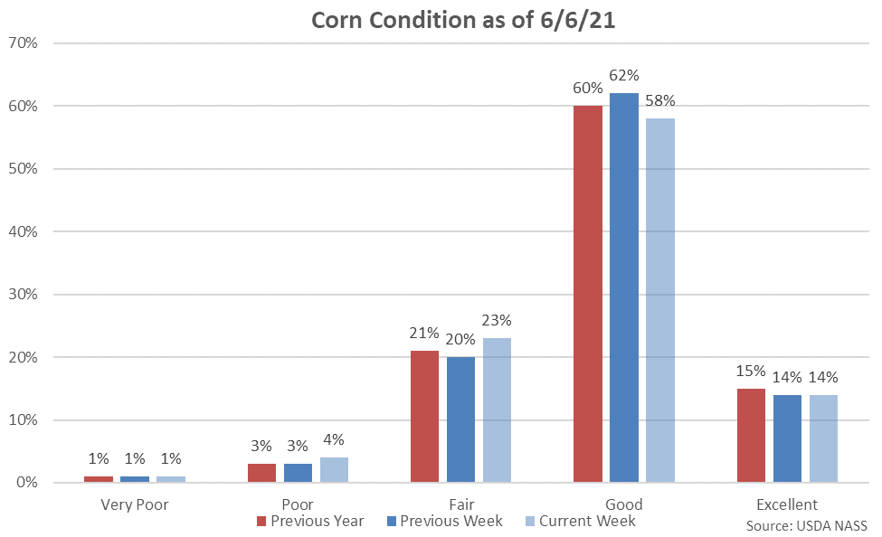 72% of the current corn crop was identified to be in good or excellent condition as of the week ending Jun 6th, down four percent from the previous week. The current corn crop identified to be in good or excellent condition finished below analyst expectations of 74%. Five percent of the current corn crop was identified to be in very poor or poor condition, up one percent from the previous week.