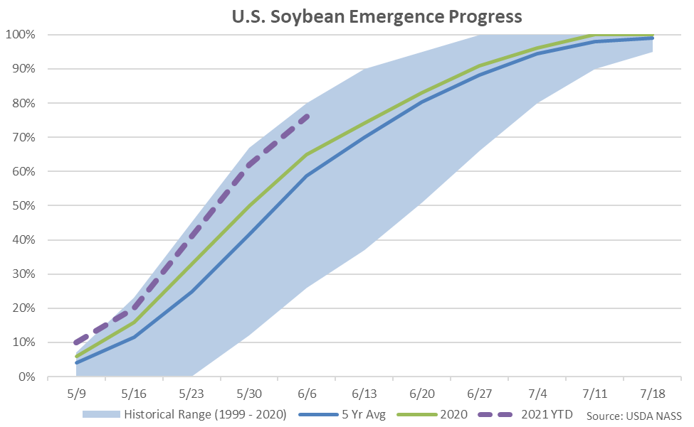 Soybean emergence as of the week ending Jun 6th was 76% complete, finishing ahead of last year’s pace of 65% completed and the five year average pace of 59% completed.