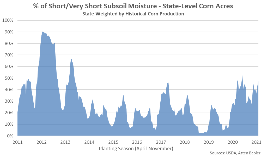 It is estimated that 48% of state-level corn acres had short-to-very short subsoil moisture as of the week ending Aug 8th, up three percent from the previous week and reaching a five month high level.