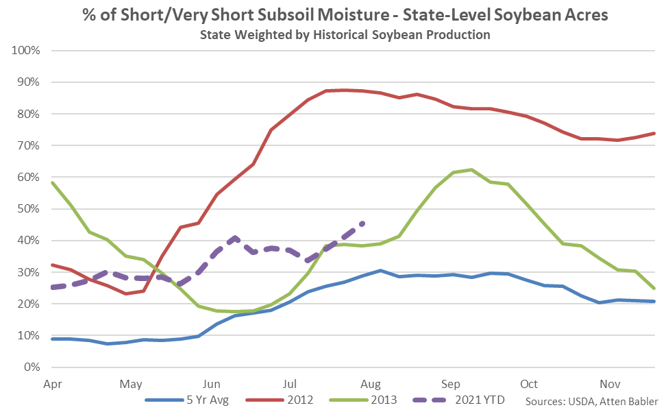 The percentage of U.S. soybeans with short-to-very short subsoil moisture reached a nine year high seasonal level as of the week ending Aug 8th but remained significantly below the 2012 seasonal level of 87%.