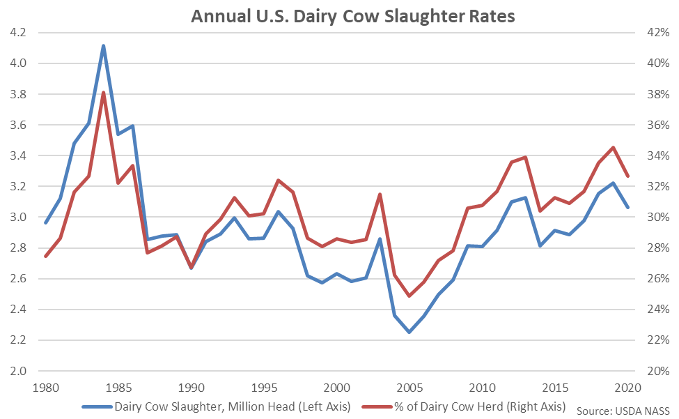 2019 annual dairy cow slaughter rates increased 2.3% on a YOY basis, reaching a 33 year high and a 35 year high level on a percentage of the total dairy cow herd basis. 2020 annual dairy cow slaughter rates declined 5.6% on a YOY basis, however, reaching a three year low level on both an absolute and percentage of the total dairy cow herd basis.