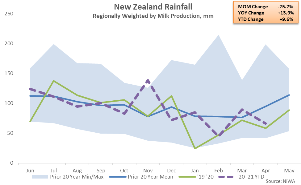Apr ’21 New Zealand rainfall volumes finished 13.9% above previous year levels when weighted regionally by milk production volumes but remained at the second lowest seasonal level experienced throughout the past five years. Rainfall levels finished 30.2% below 20 year average seasonal levels for the month of April.